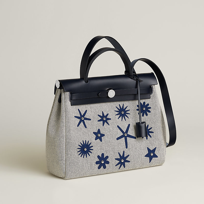 H Plume travel bag in canvas with "Circuit Rider" pattern, shoulder strap, foldable handles, zipped outer pocket and palladium-plated saddle stud lock.