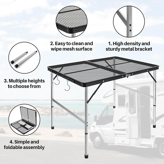 【Fashionable design】Our camping table adopts a specially coated metal mesh design, which is waterproof and rust resistant.The aluminum alloy frame and hexagonal thickened aluminum alloy table legs make the camping table more sturdy and durable.It is worth mentioning that this table is also a portable camping table, which can be folded and stored. The portable design makes it more convenient to carry and easy to take away anytime, anywhere.