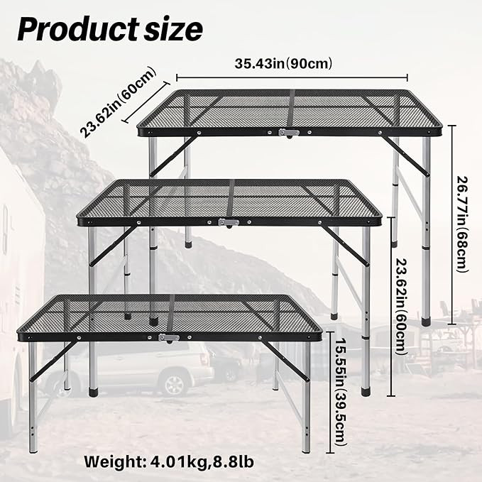 【Dimensions and Weight】Folding Table size:The folding size is 17.71 inches * 23.62 inches * 2.75 inches. The assembled size is 35.43 inches * 23.62 inches. This folding table has three height adjustable options: 14.96 inches, 23.62 inches, and 26.77 inches. The folding camp table weighs only 4kg and can withstand approximately 90 pounds.